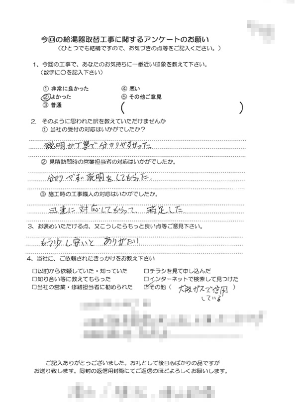 給湯器取替工事(大阪市東淀川区 S様の声)