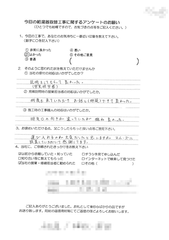 給湯器取替工事(大阪市東淀川区 K様の声)