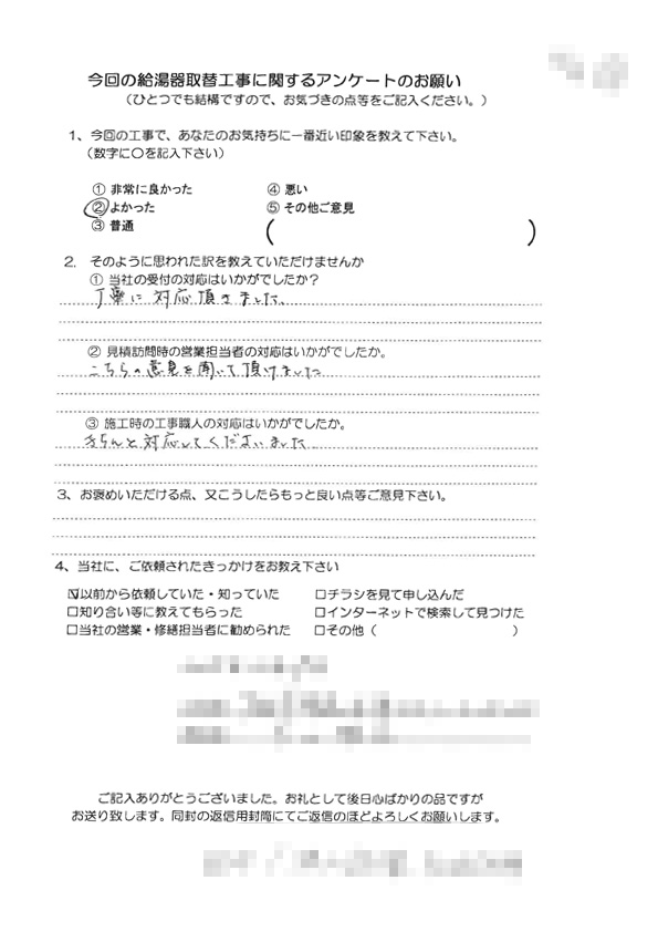 給湯器取替工事(大阪市東淀川区 O様の声)