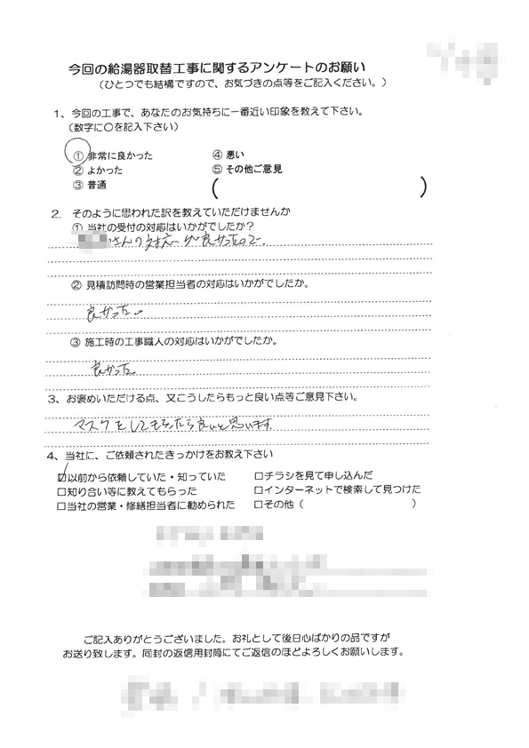 給湯器取替工事(大阪市東淀川区 O様の声)