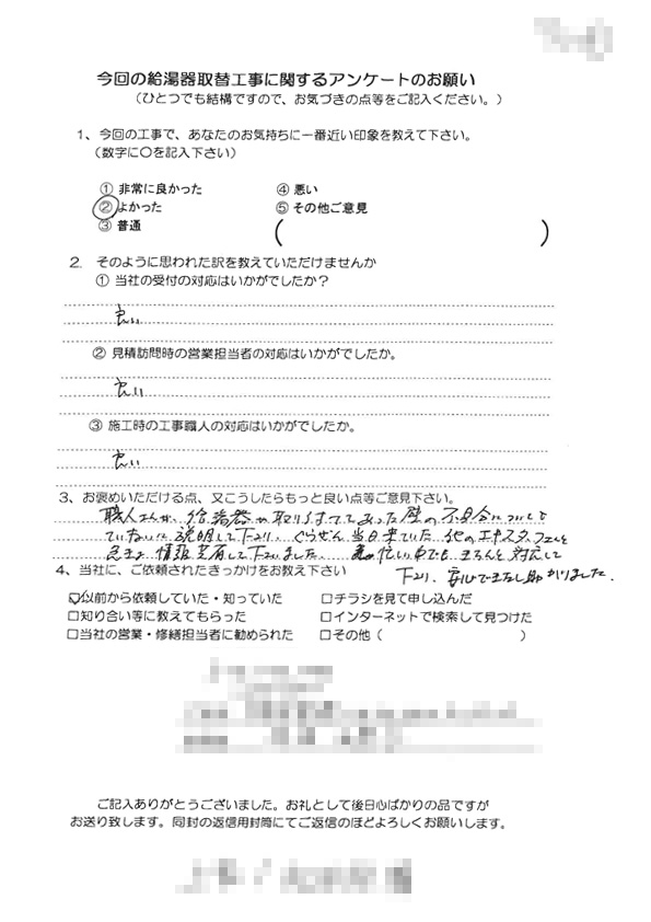 給湯器取替工事(大阪市東淀川区 I様の声)