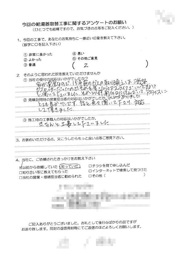 給湯器取替工事(大阪市東淀川区 S様の声)