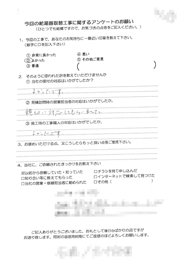 給湯器取替工事(大阪市東淀川区 T様の声)